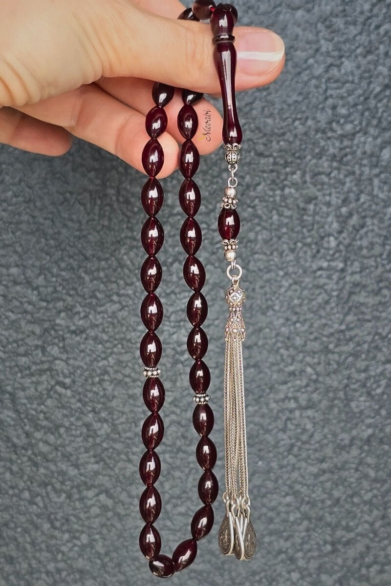 925 Ayar Gümüş Püsküllü Beyzi Kesim Sıkma Kehribar Tesbih 33'lü