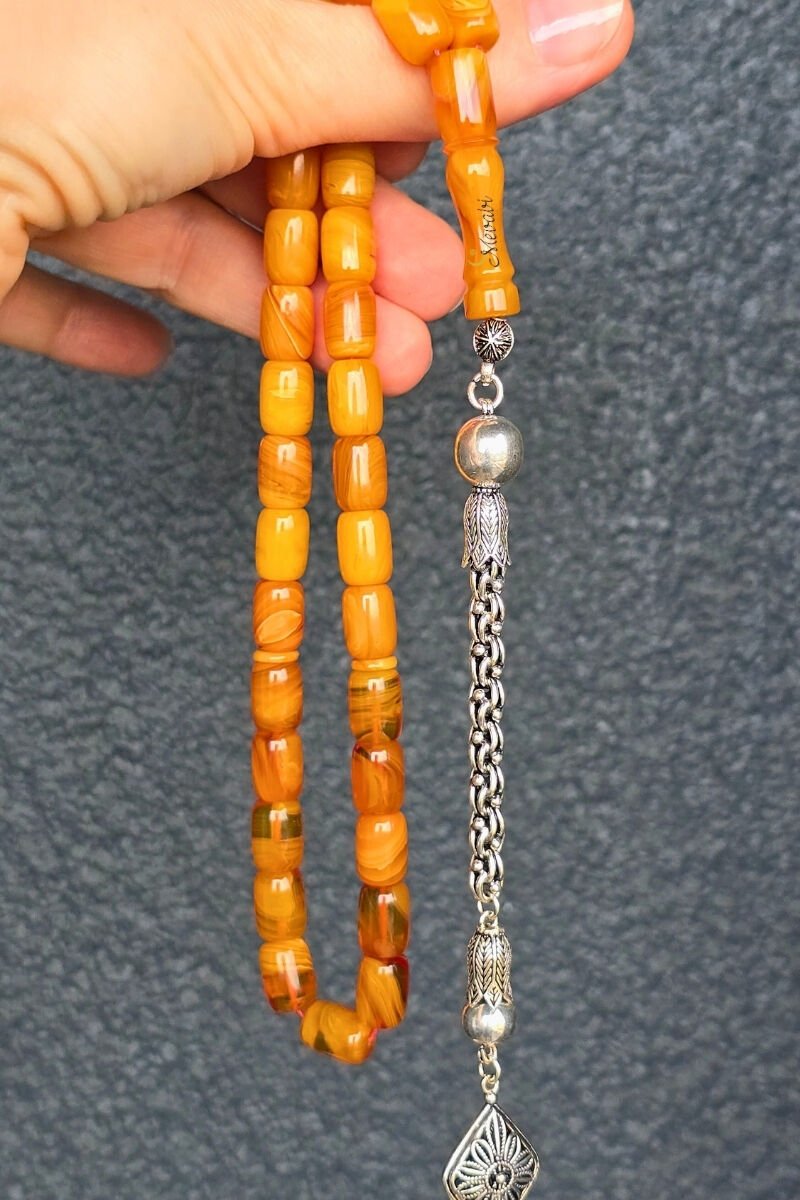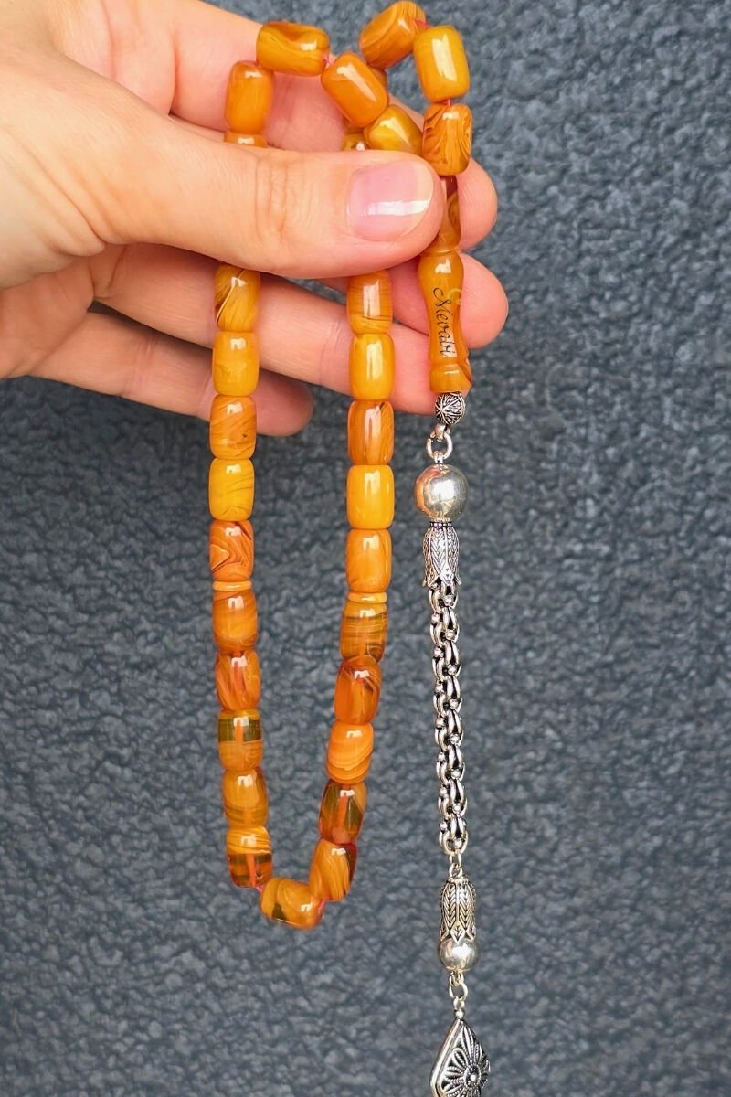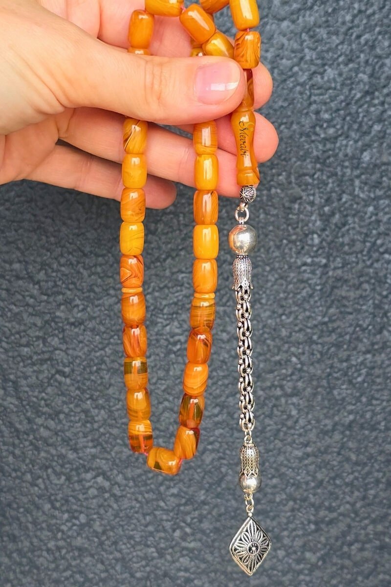 925 Ayar Gümüş Püsküllü Kapsül Kesim Sarı Sıkma Kehribar Tesbih 33'lü