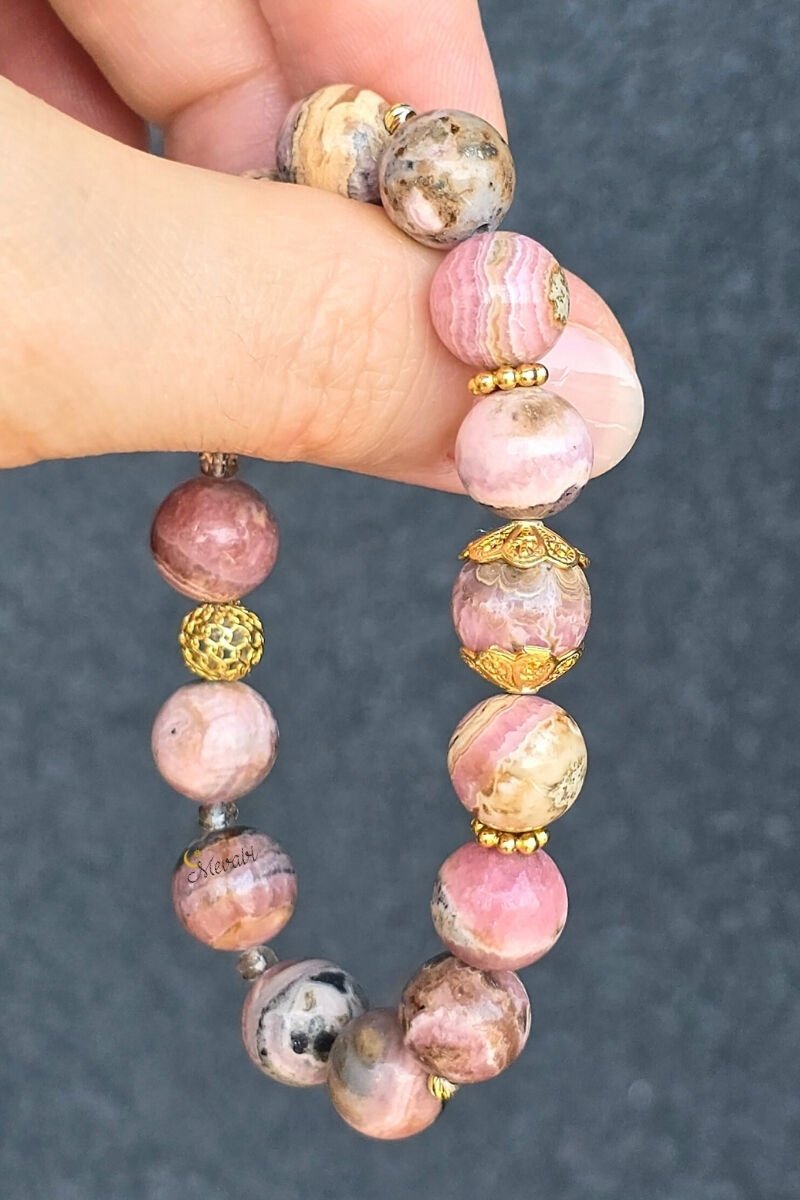 Dilruba Rodokrozit Doğal Taş Tasarım Bileklik-1 (925 Ayar Gümüş Üzeri 14K Altın Kaplama)