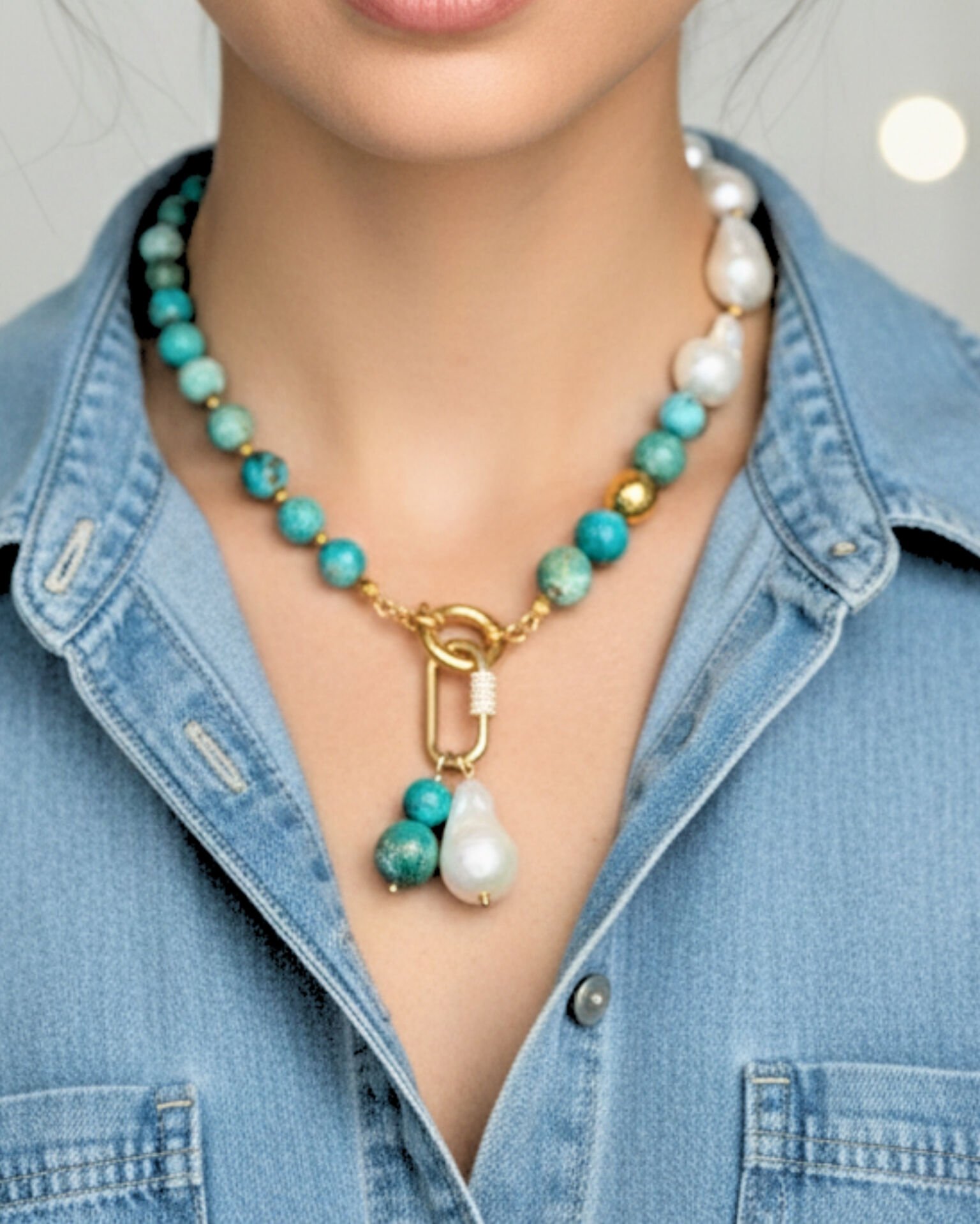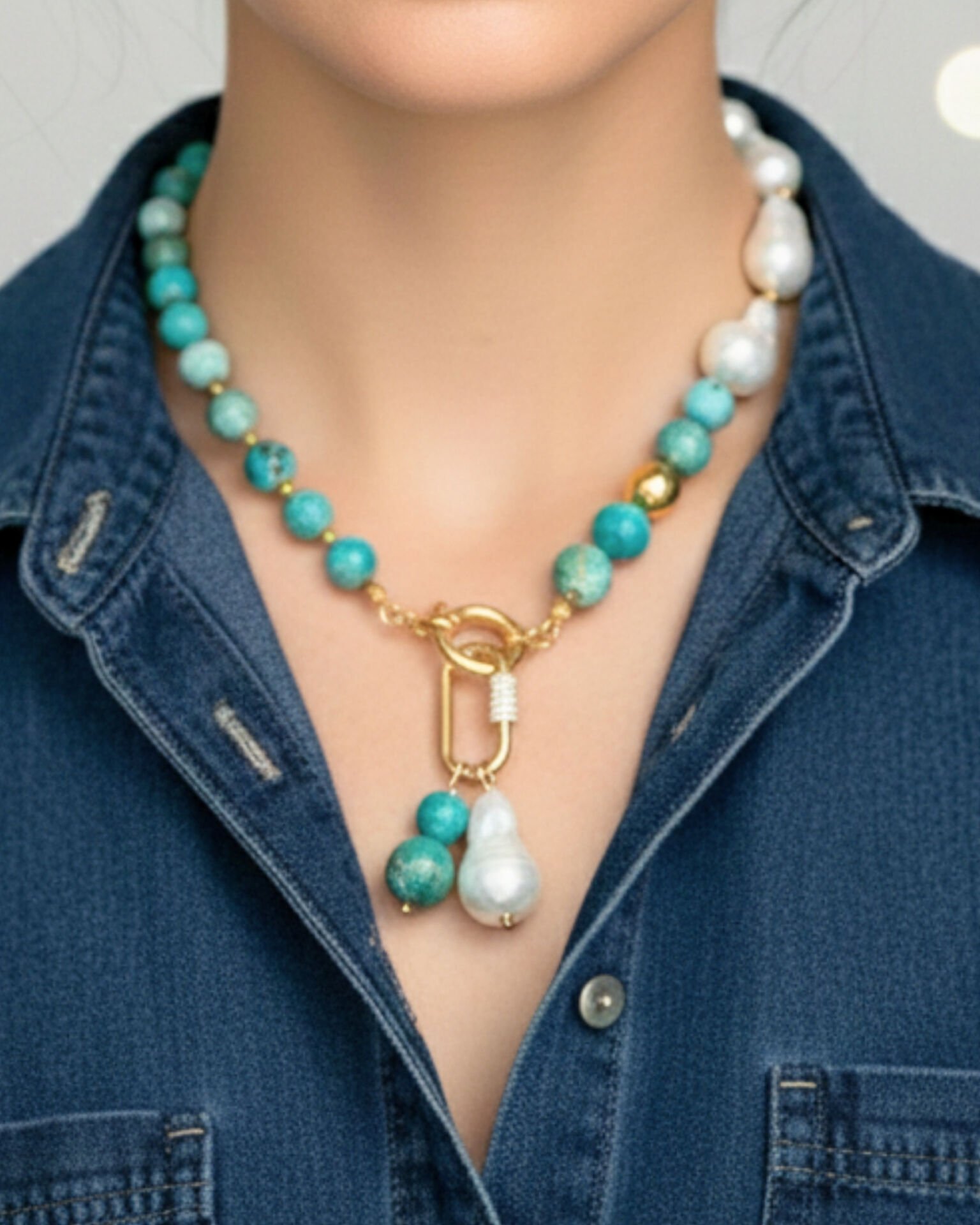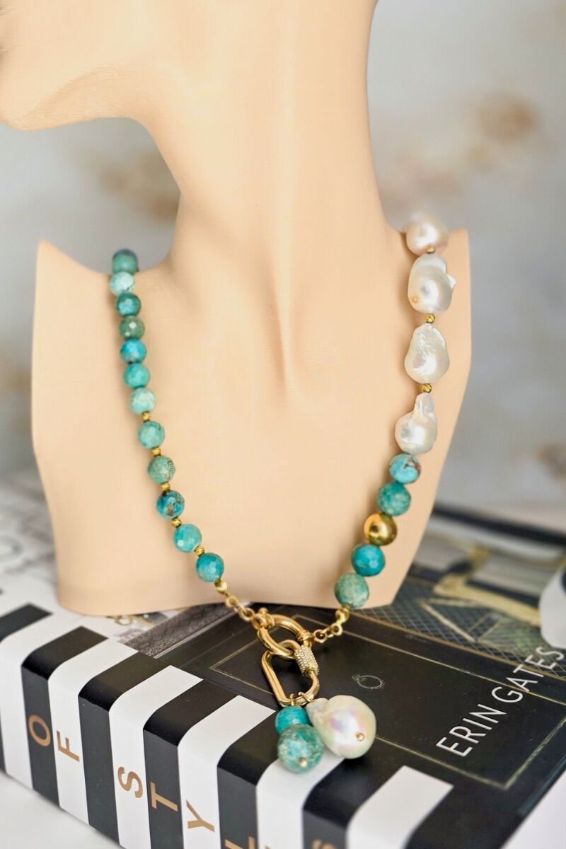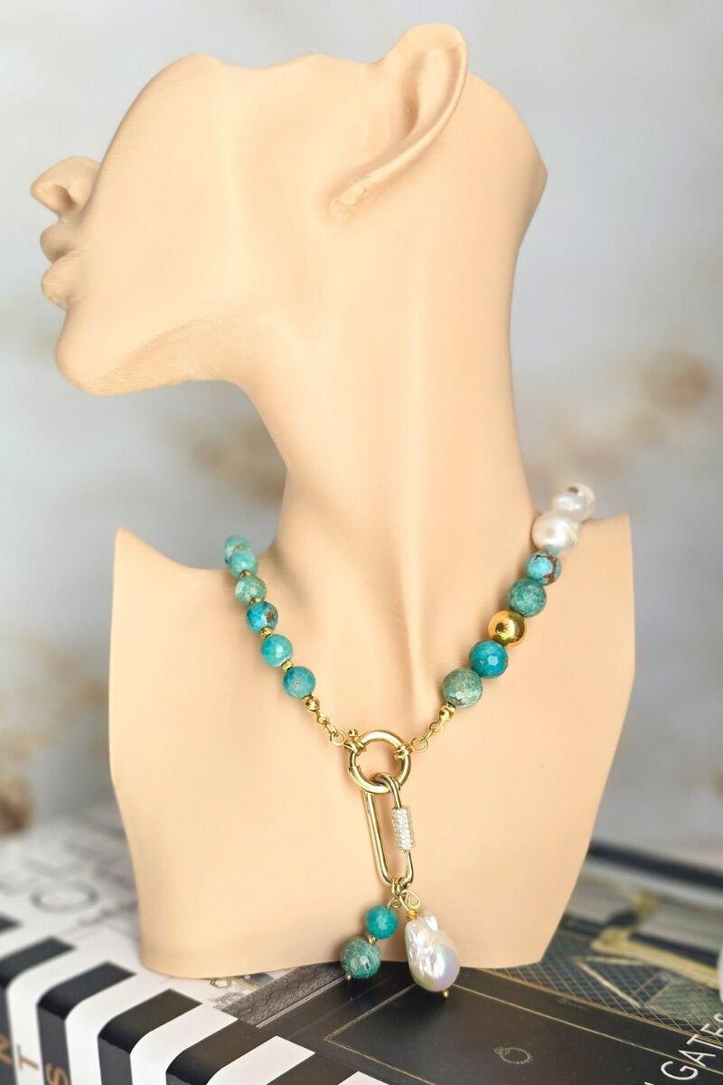 Eliza Turkuaz + Barok İnci Doğal Taş Tasarım Kolye (925 Ayar Gümüş Üzeri 14K Altın Kaplama)