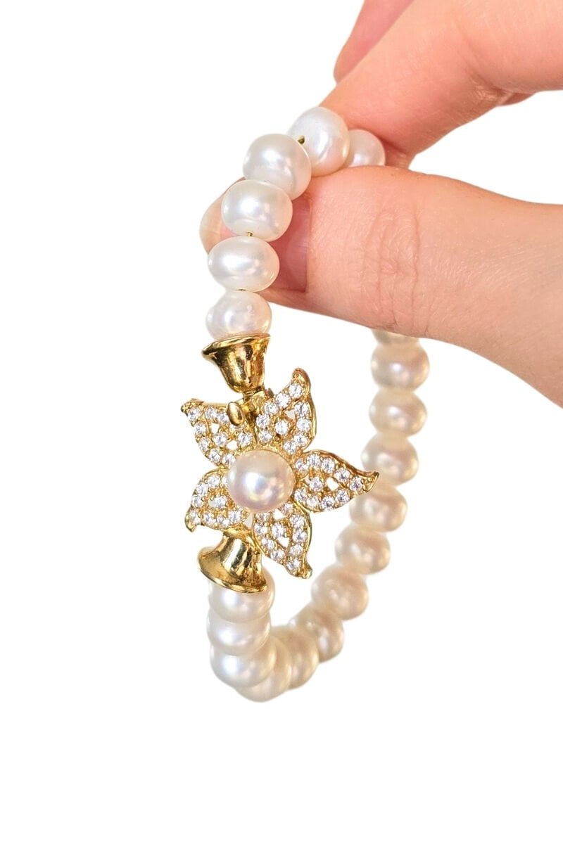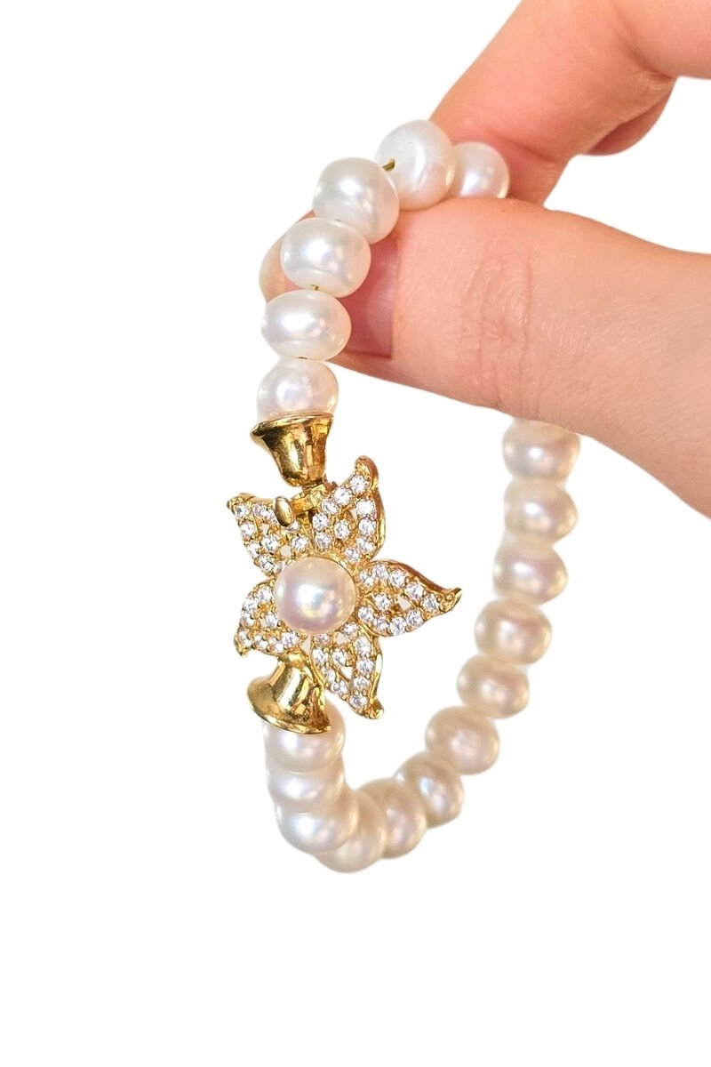 Majori Gerçek İnci Doğal Taş Tasarım Bileklik-13 (925 Ayar Gümüş Üzeri 14K Altın Kaplama)