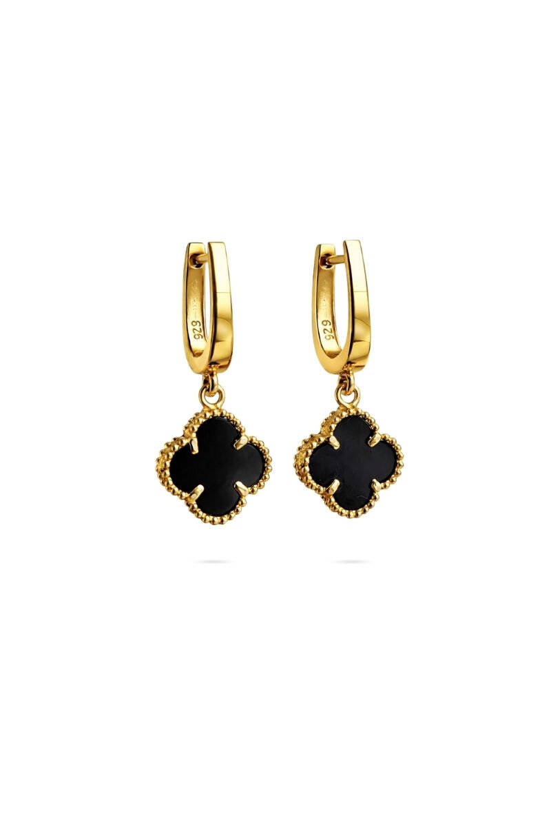 Altın Kaplama Gümüş Doğal Siyah Oniks Yonca Küpe
