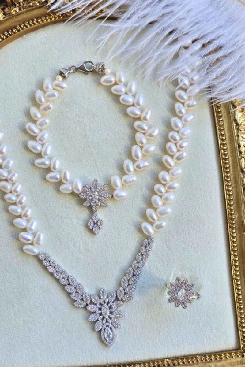 İnci set takımlarımız, inci kolye, inci yüzük, inci bileklik gibi farklı parçaların bir araya gelmesiyle oluşur ve şık bir uyum içinde tasarlanmıştır.