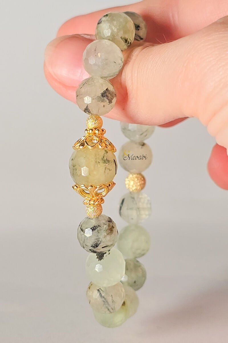Sare Prehnite Doğal Taş Tasarım Bileklik-2 (925 Ayar Gümüş Üzeri 14K Altın Kaplama)