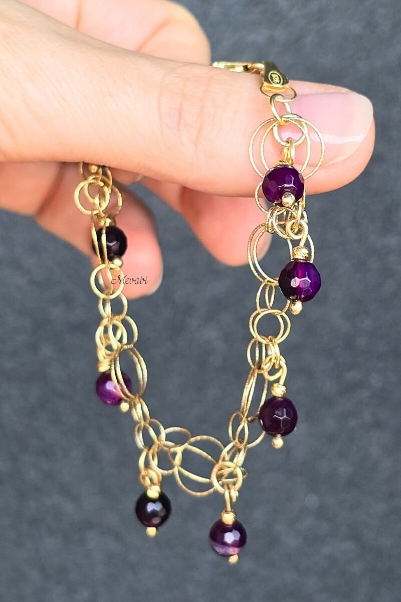 Zeren Ametist Doğal Taş Tasarım Bileklik-5 (925 Ayar Gümüş Üzeri 14K Altın Kaplama)